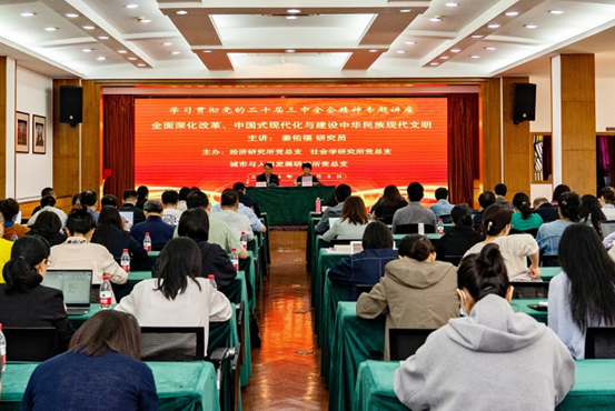 为贯彻落实院党委关于学习宣传党的二十届三中全会精神的有关部署,2024年10月8日上午,城市人口所党总支联合我院经济研究所党总支、社会学研究所党总支联合举办主题党日活动。活动邀请上海市学习贯彻党的二十届三中全会精神宣讲团成员,上海社会科学杂志社社长、总编辑,哲学研究所姜佑福研究员主讲,主题为“全面深化改革、中国式现代化与建设中华民族现代文明——党的二十届三中全会精神学习辅导报告”。