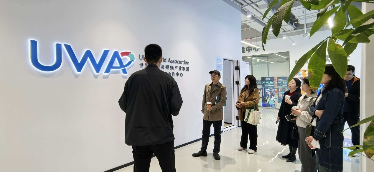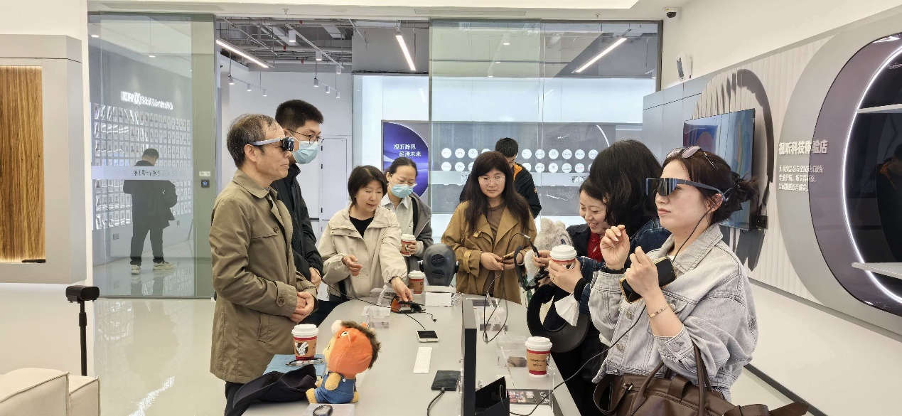 第二站,支部全体党员转赴“视听静界”园区。该园区于2025年底建成并投入运营,采用“政府+科研高校+认证平台+创新企业”的合作模式,定位为超高清视听领域创新型企业的支持平台,与“美创静界”美妆健康创新生态社区形成联动,提供办公、研发与展示等多元功能空间。园区内特设“派客家”OPC 创新社区,支持“一人公司”创业模式,已吸引约30家企业入驻,业务涵盖电竞动漫、AI+大视听应用等领域。党员们依次参观并体验了视听科技体验店的各种视听类产品、世界超高清视频产业联盟上海生态合作中心的Audio Vivid车载空间沉浸式环绕立体声等,感受了从一楼的技术展示到四楼的产学研联动。